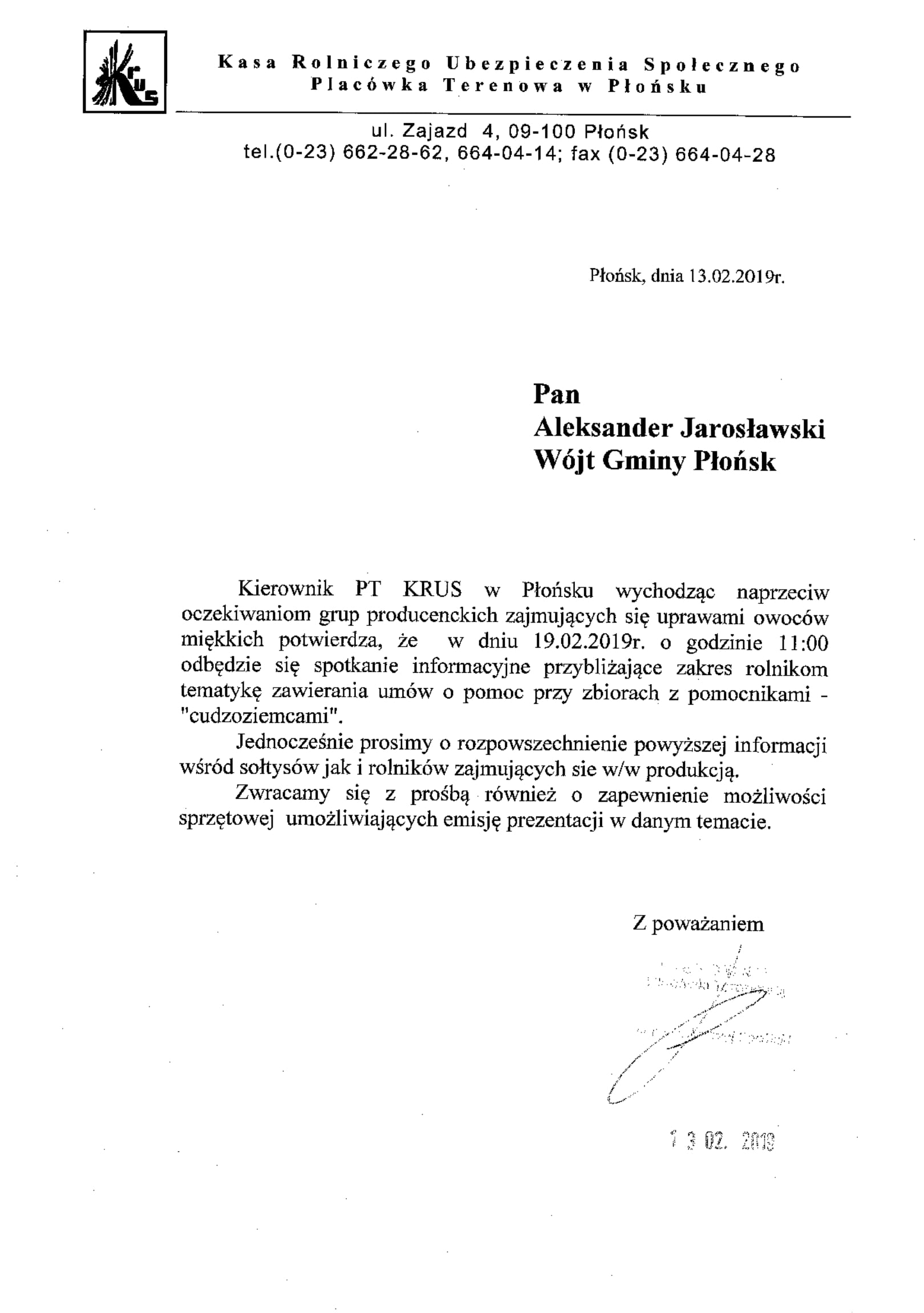 Kierownik PT KRUS w Płońsku wychodząc naprzeciw oczekiwaniom grup producenckich zajmujących się uprawami owoców miękkich potwierdza, że w dniu 19.02.2019r. na sali konferencyjnej Urzędu Gminy w Płońsku o godzinie 11:00 odbędzie się spotkanie informacyjne przybliżające zakres rolnikom tematykę zawierania umów o pomoc przy zbiorach z pomocnikami - "cudzoziemcami"