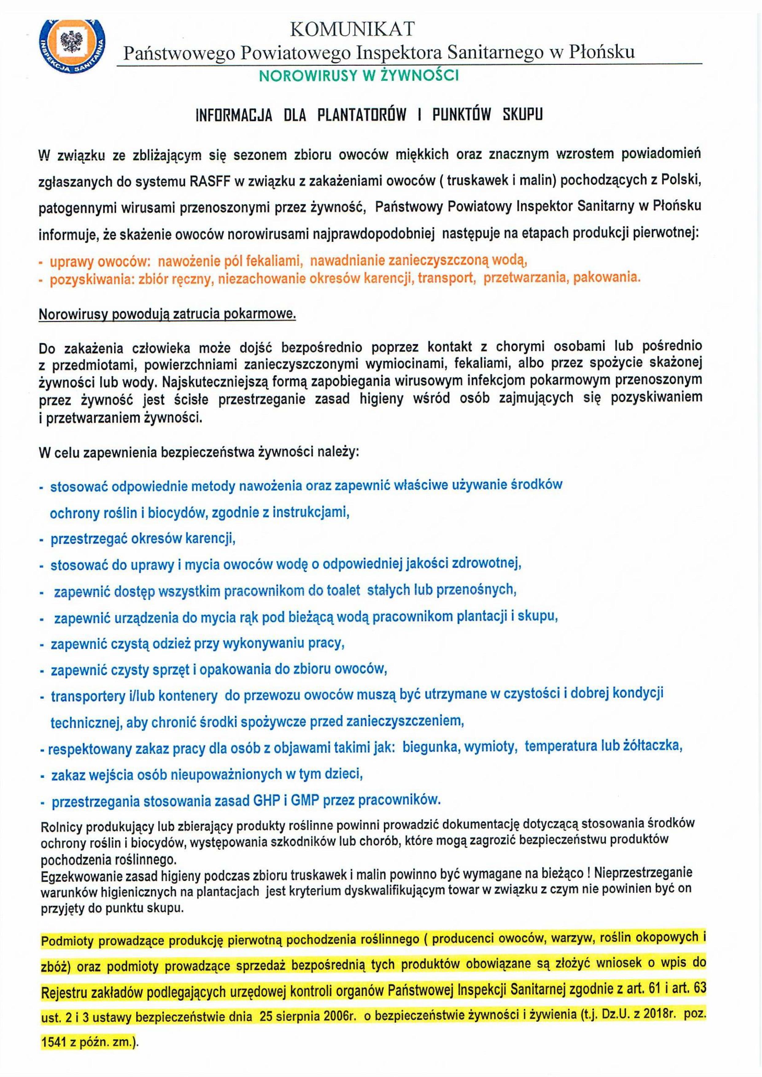 Państwowy Powiatowy Inspektor Sanitarny w Płońsku przypomina o obowiązku rejestracji produkcji pierwotnej. W związku ze zbliżającym się sezonem zbioru owoców miękkich PPIS zwraca uwagę na jakość stosowanych powtórnie opakowań przy zbiorach i informuje o możliwości skażenia owoców norowirusami.